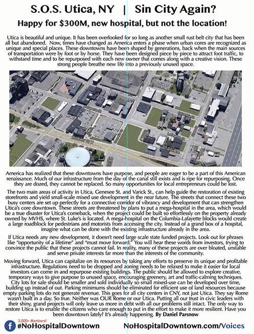 Downtown Utica is better without an out-of-scale hospital that bulldozes our historic urban core. #NoHospitalDowntown is "yes hospital", we simply want the new hospital at St. Luke's where they own 64-acres, and not in the Columbia Lafayette Neighborhood. Here's Why We Oppose The Downtown Utica Hospital Concept and Many Agree!