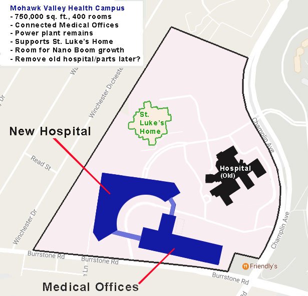 Don't abandon St. Luke's and St. Elizabeth's, because the area does not have a very good track record. Consider abandon sites that are still vacant and or under utilized; Old Main (100 acres), Charlestown Mall (18.5 acres), Bendix/TRW on Seward Avenue (12.3 acres), Bossert Manufacturing, Harbor Point, Leland Area, GE Plant on Broad Street (23 acres), downtown ConMed building (1.1 acres), Old GE plant at Culver & Bleecker Streets (10.5 acres), Washington Courts (5.5 acres), Mele Manufacturing on Erie Street (6.3 acres), Dunlap on Oriskany Blvd (3.78 acres) and a few old schools.