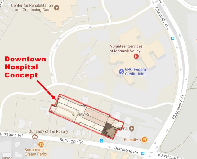 The MVHS Certificate of Need (CON) states that the Faxton Campus and St. Elizabeth Medical Center will remain functioning. They are just 1.1 and 1.7 miles respectively from OCMD, and each is surrounded by 100-years of healthcare and medical offices and facilities; too numerous to mention (but we'll list them soon below)