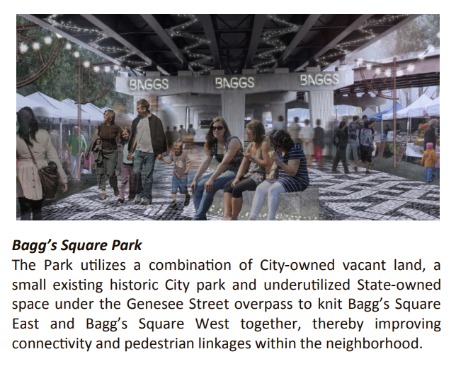 Bagg’s Square Park The Park utilizes a combination of City-owned vacant land, a small existing historic City park and underutilized State-owned space under the Genesee Street overpass to knit Bagg’s Square East and Bagg’s Square West together, thereby improving connectivity and pedestrian linkages within the neighborhood.