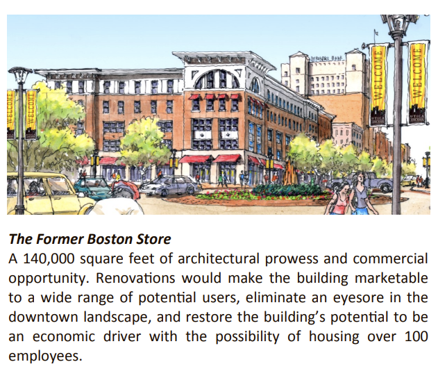 The Former Boston Store A 140,000 square feet of architectural prowess and commercial opportunity. Renovations would make the building marketable to a wide range of potential users, eliminate an eyesore in the downtown landscape, and restore the building’s potential to be an economic driver with the possibility of housing over 100 employees.