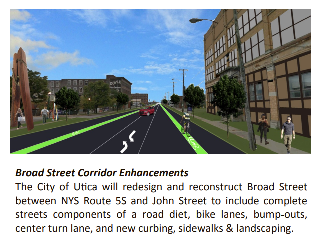 Broad Street Corridor Enhancements The City of Utica will redesign and reconstruct Broad Street between NYS Route 5S and John Street to include complete streets components of a road diet, bike lanes, bump-outs, center turn lane, and new curbing, sidewalks & landscaping.