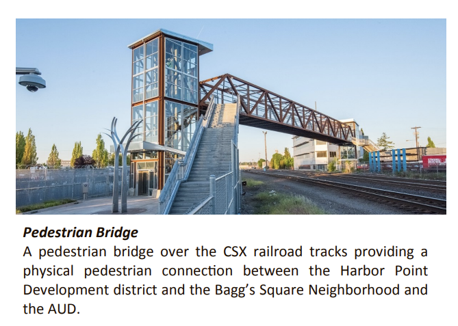 Pedestrian Bridge A pedestrian bridge over the CSX railroad tracks providing a physical pedestrian connection between the Harbor Point Development district and the Bagg’s Square Neighborhood and the AUD.